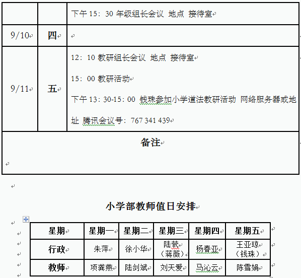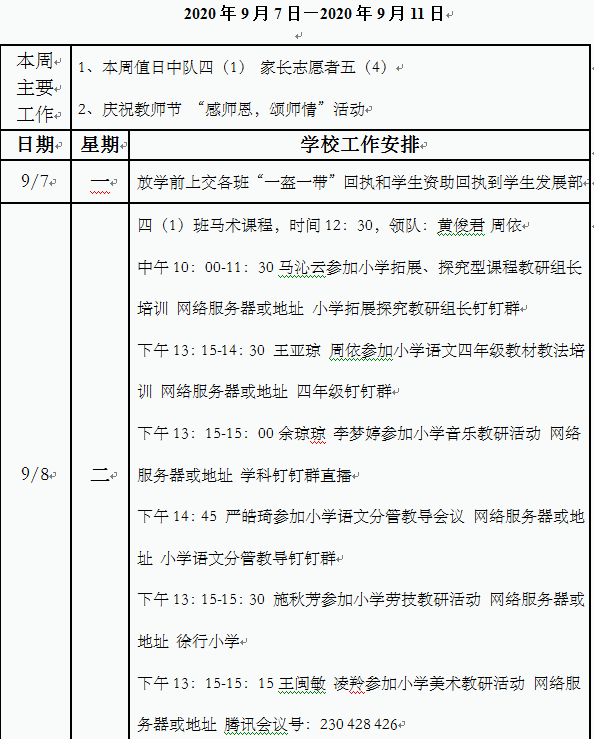 2020学年第一学期第2周工作安排(小学部)