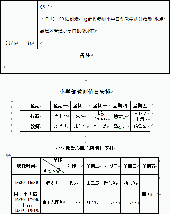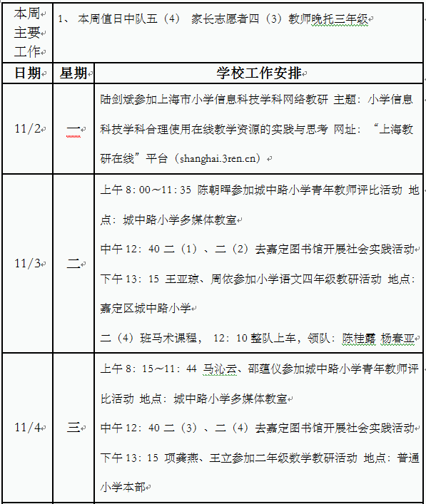 2020学年第一学期第10周工作安排(小学部)